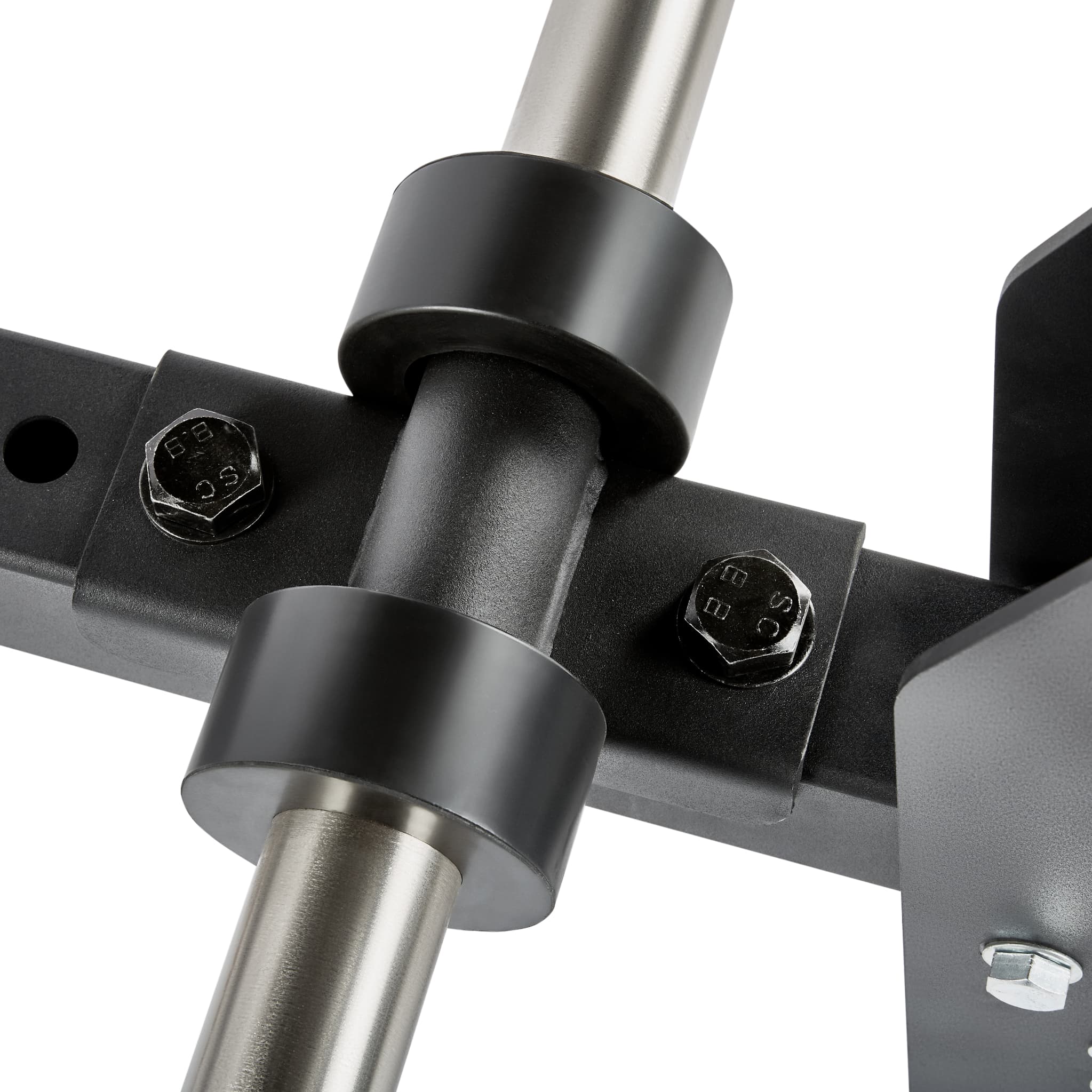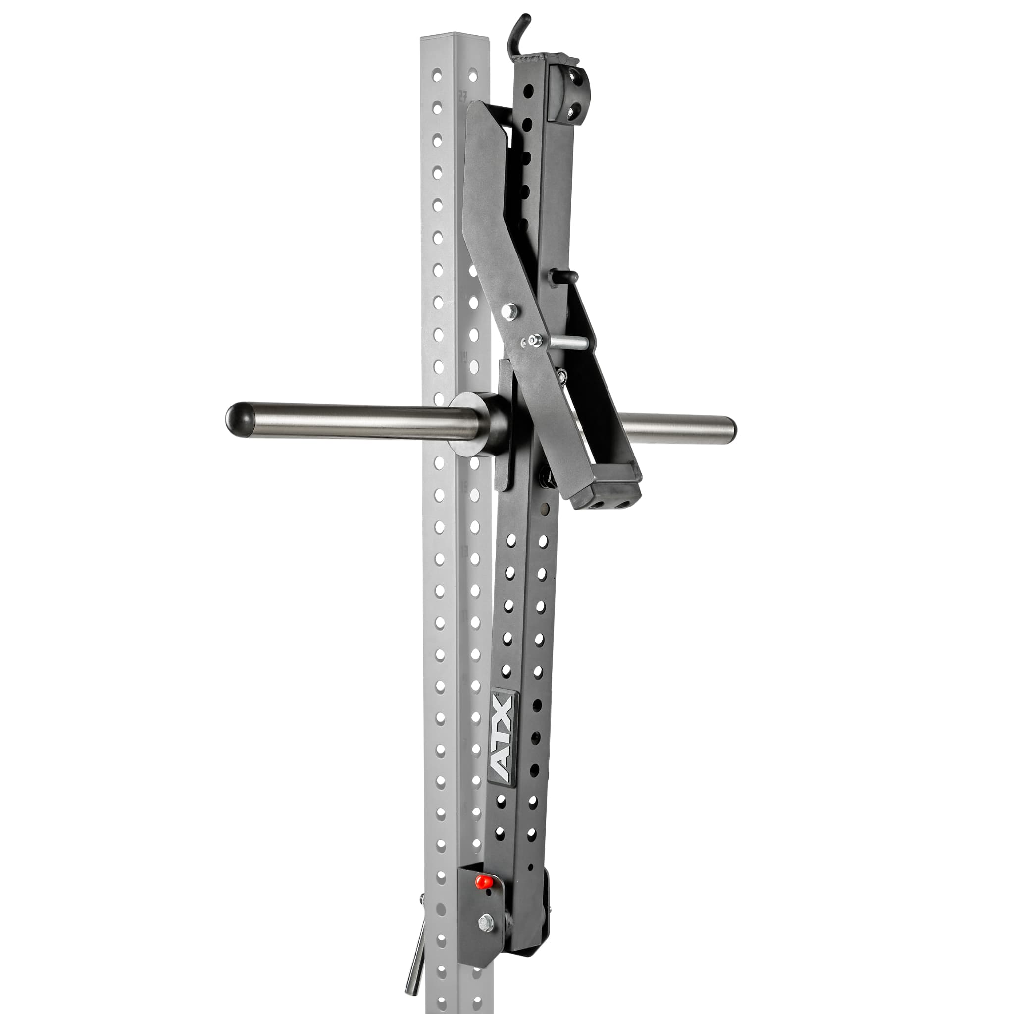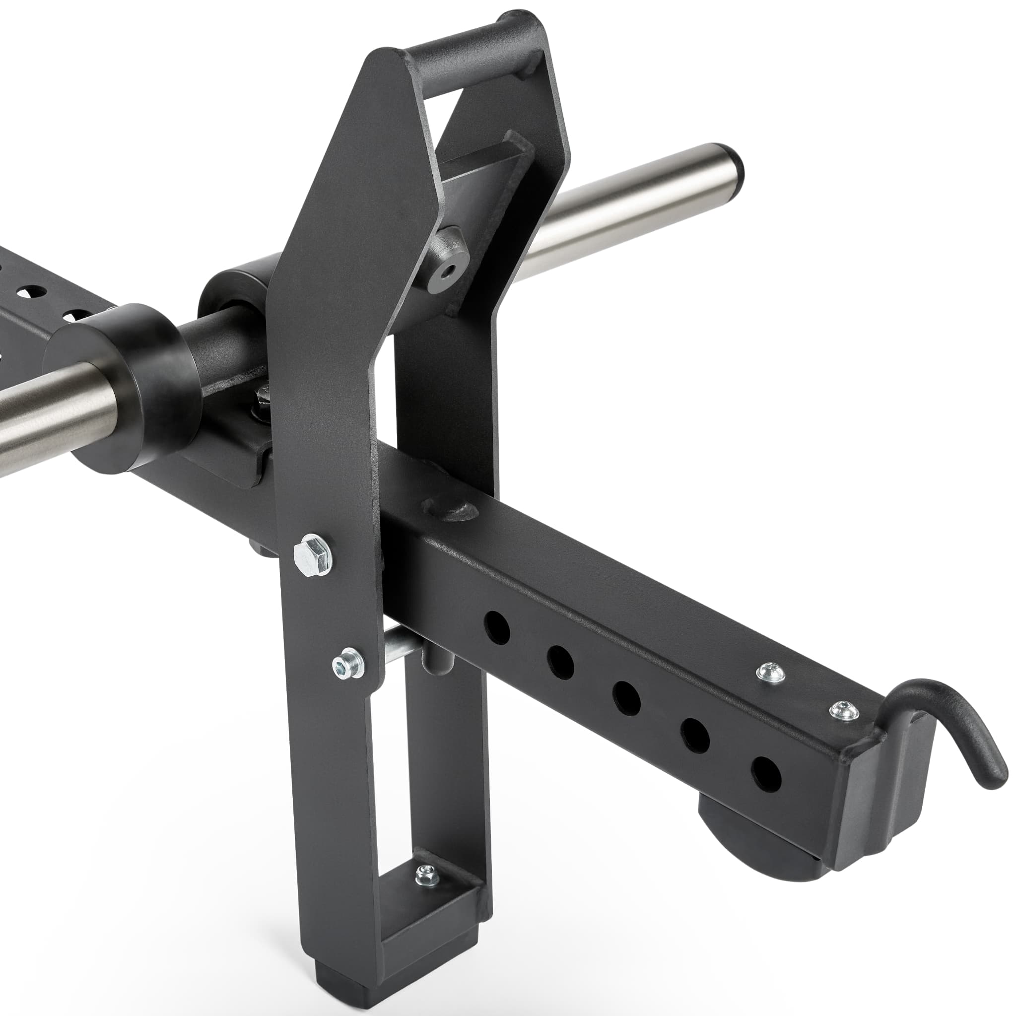 The attachment easily mounts to the uprights of the power rack without the need for tools, and features a folding mechanism that allows it to be stored upright when not in use.