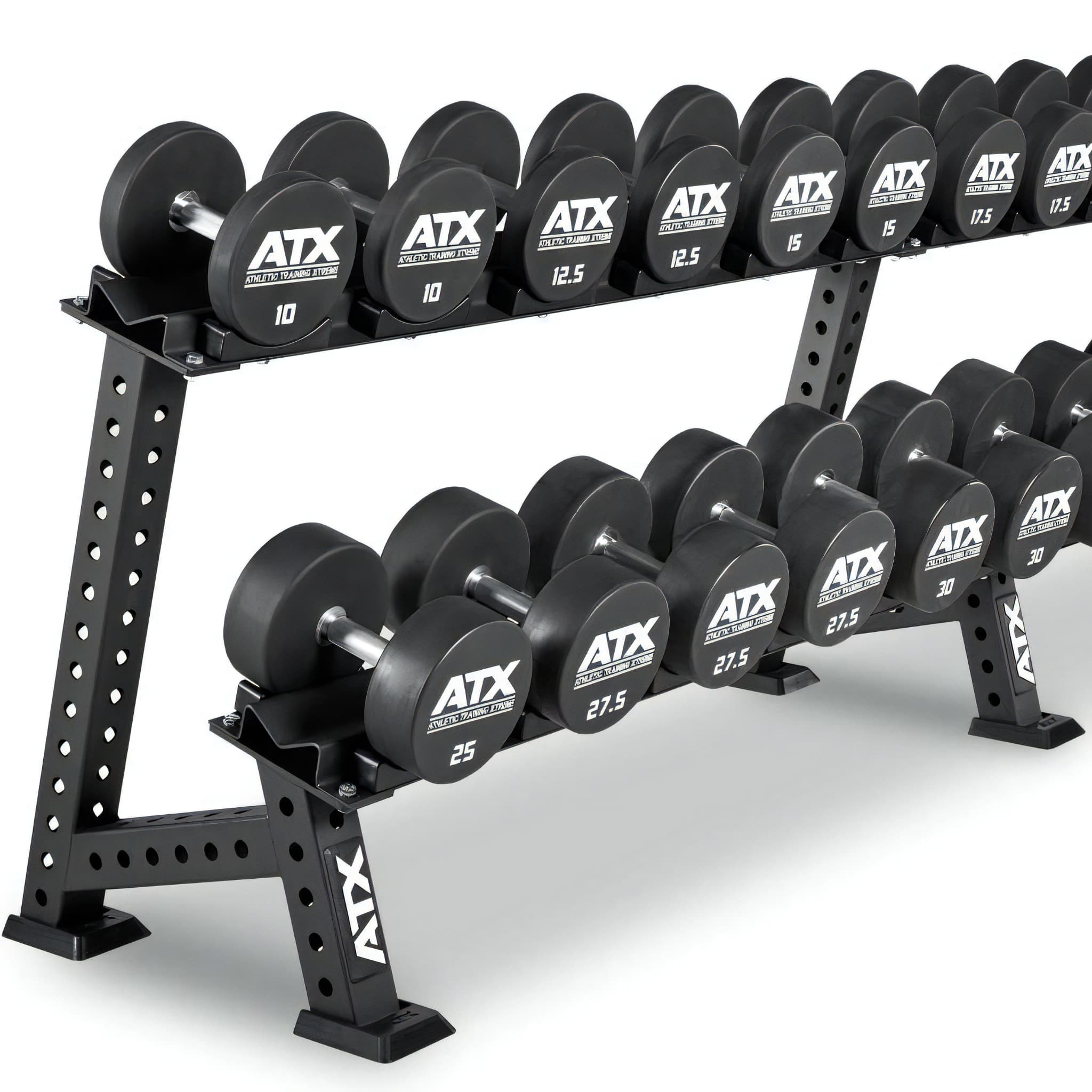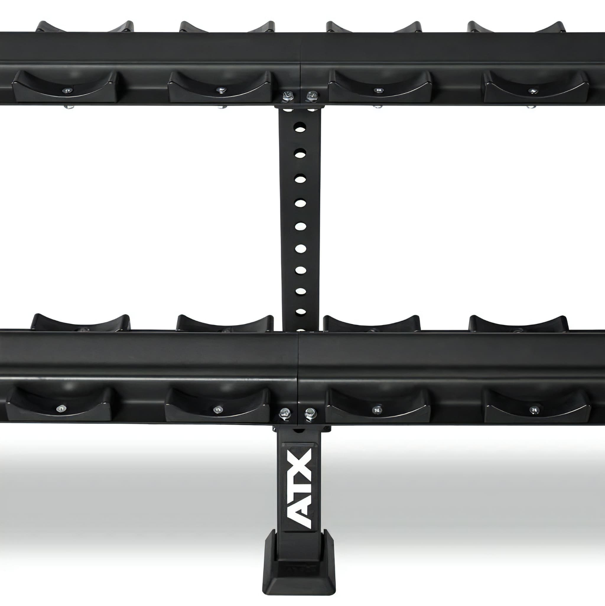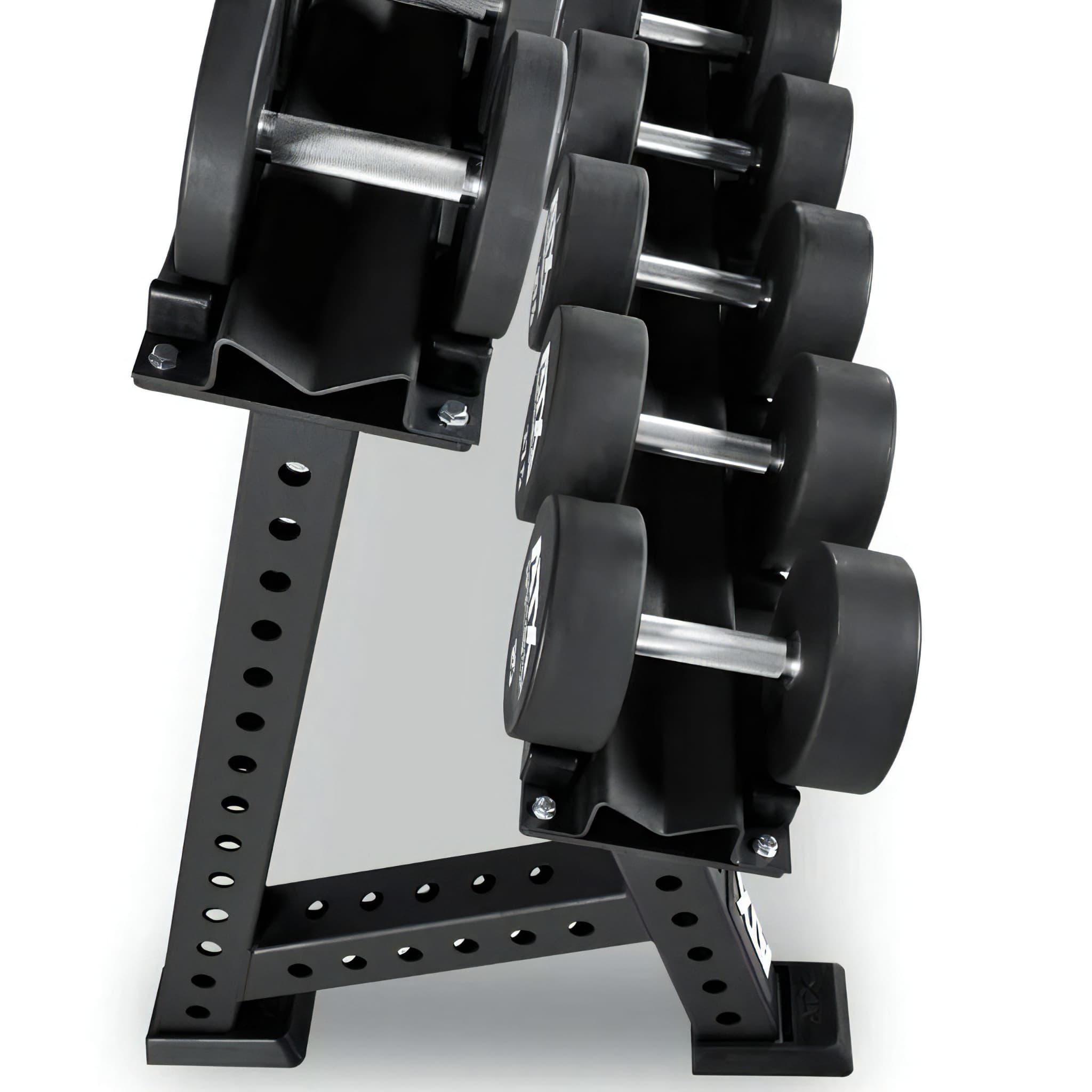 The ATX Fitness Expandable Round Dumbbell Rack is a commercial-grade storage solution, specifically designed for round dumbbells. This modular rack system is fully expandable, allowing you to extend the rack as your needs grow. Each base unit holds 6 pairs of dumbbells, and additional sections can be added to accommodate 12, 18, or more pairs.