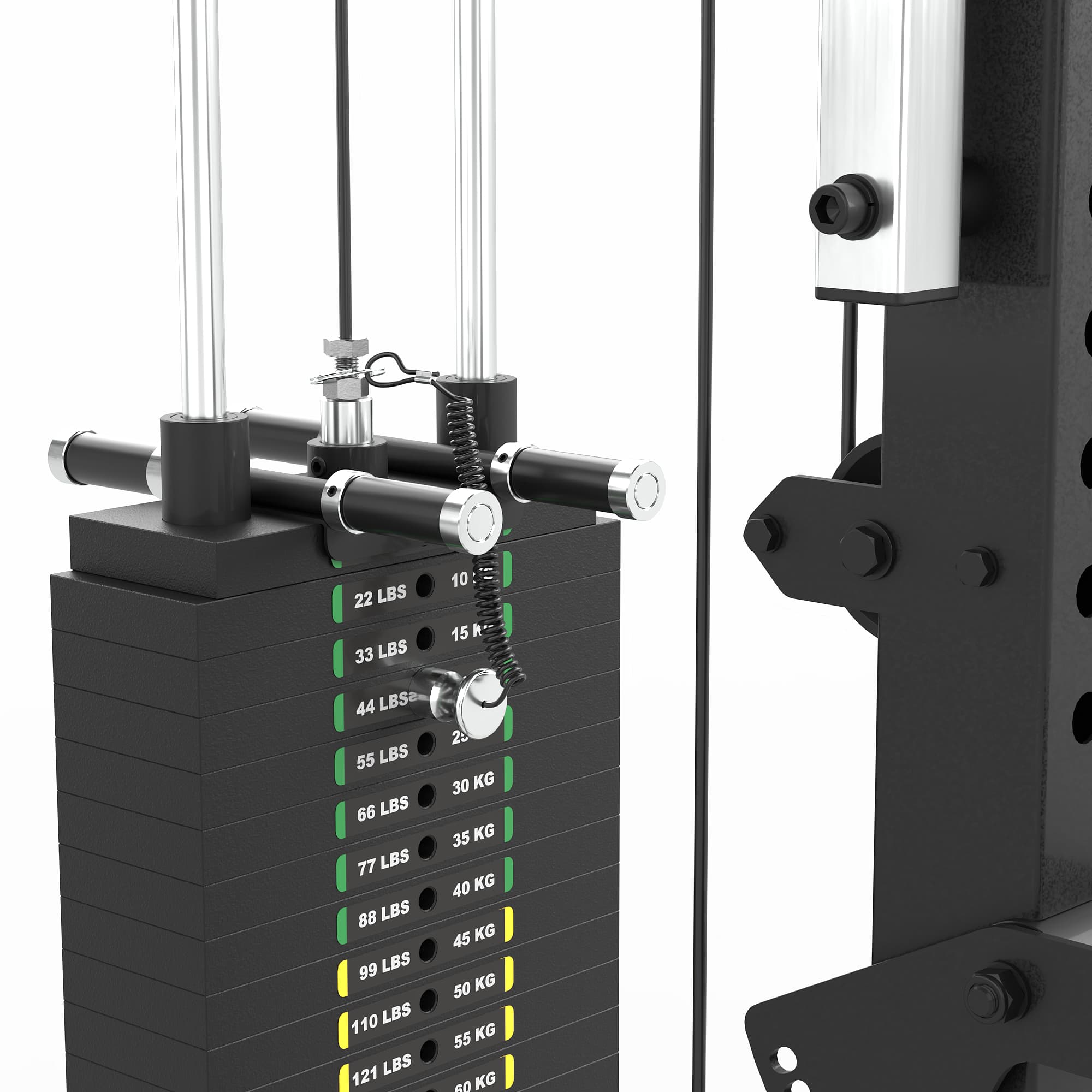 The unit includes a 125 kg (25 × 5 kg) precision-machined solid steel weight stack with a 1:1 pulley ratio (no mechanical reduction). Its heavy-duty construction supports up to 200 kg of load for both upper and lower cable exercises. Additionally, it comes equipped with roller band pegs, allowing for dynamic resistance adjustments using resistance bands.