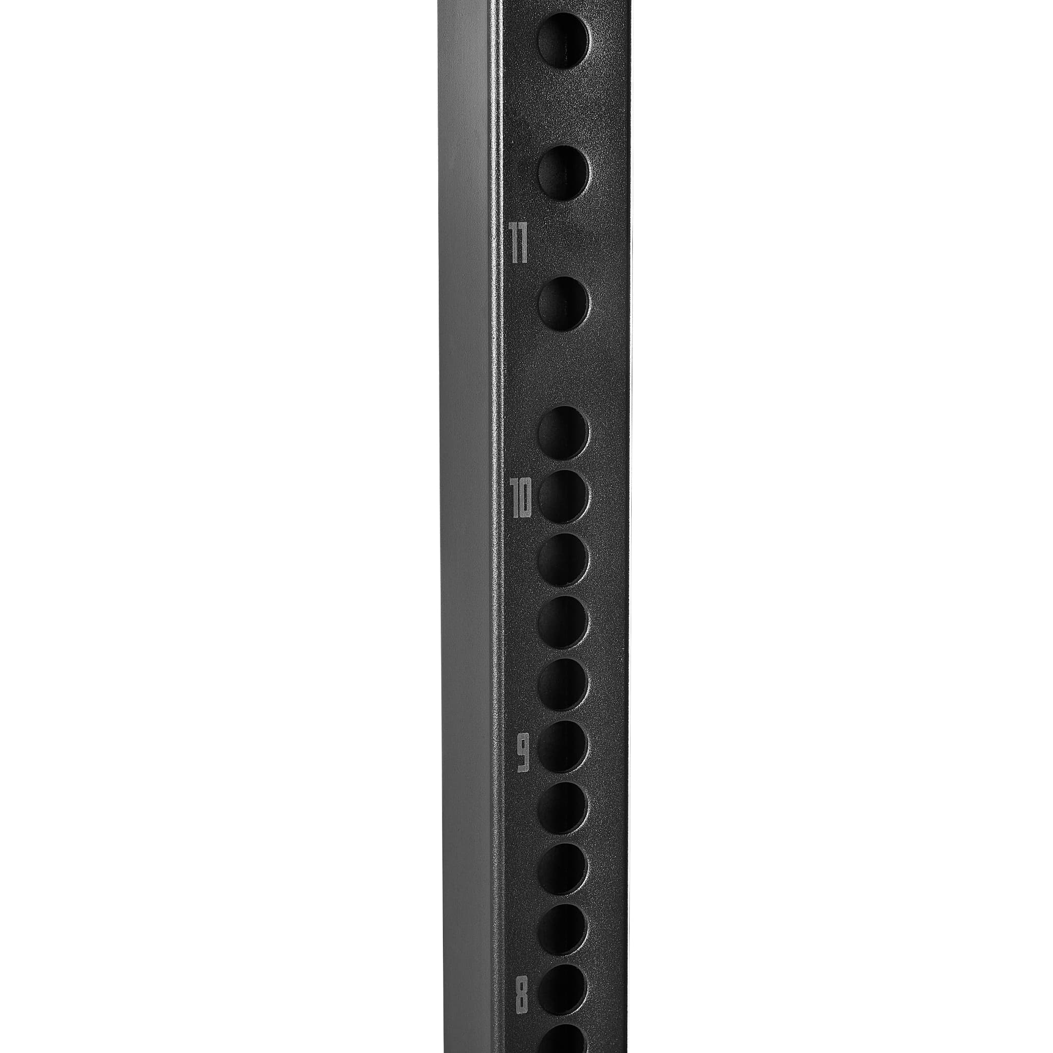 The rack provides 45 height adjustment levels, with an ultra-fine 2.5 cm hole spacing in the critical 58–133 cm range, allowing for precise positioning to suit any exercise or athlete.
