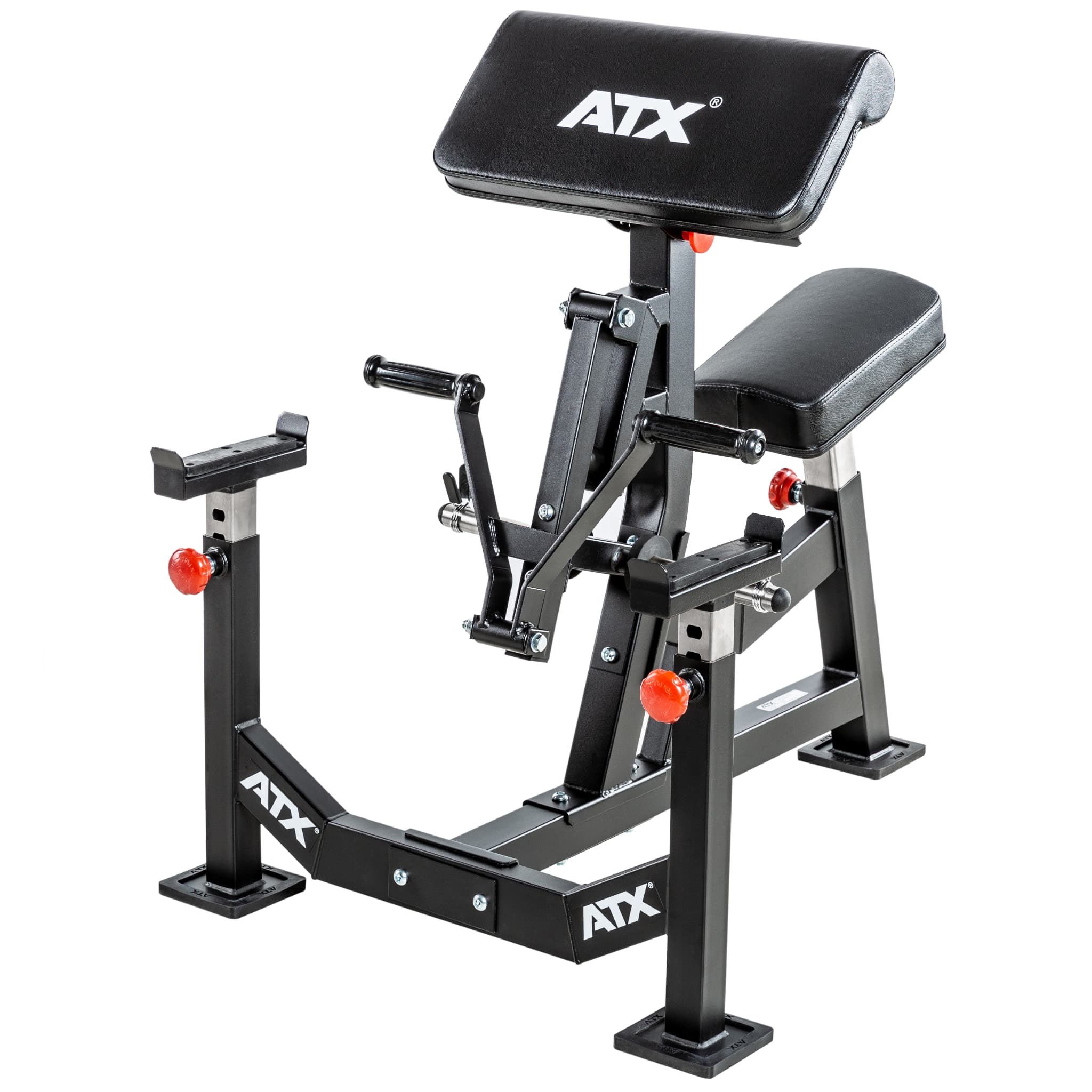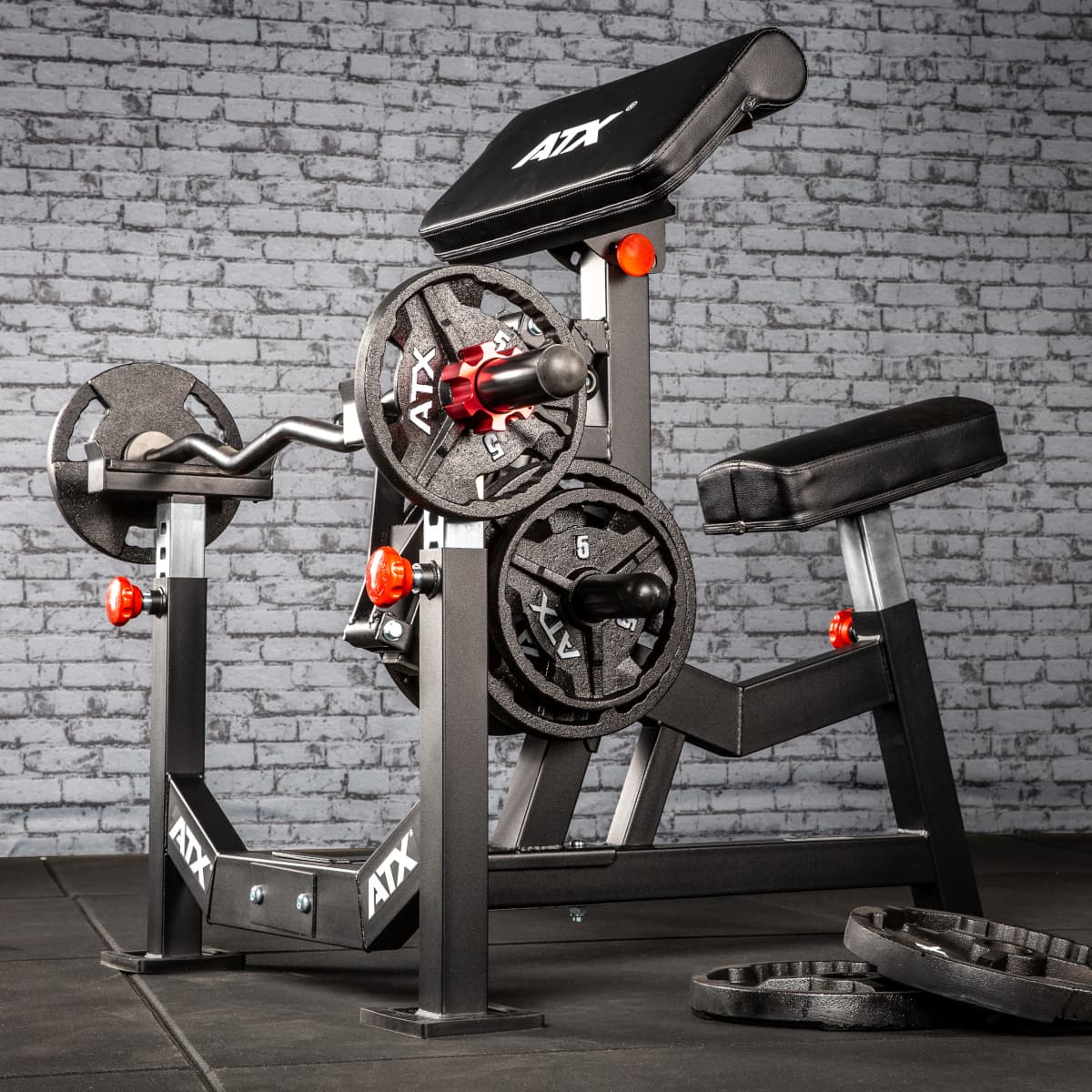 ATX Fitnessのバイセプスカールベンチは上腕二頭筋を効果的に鍛える上で便利なマシンです。レバーアームを使ったマシントレーニングとEZバー等を使用したフリーウェイトの両方に対応しています。