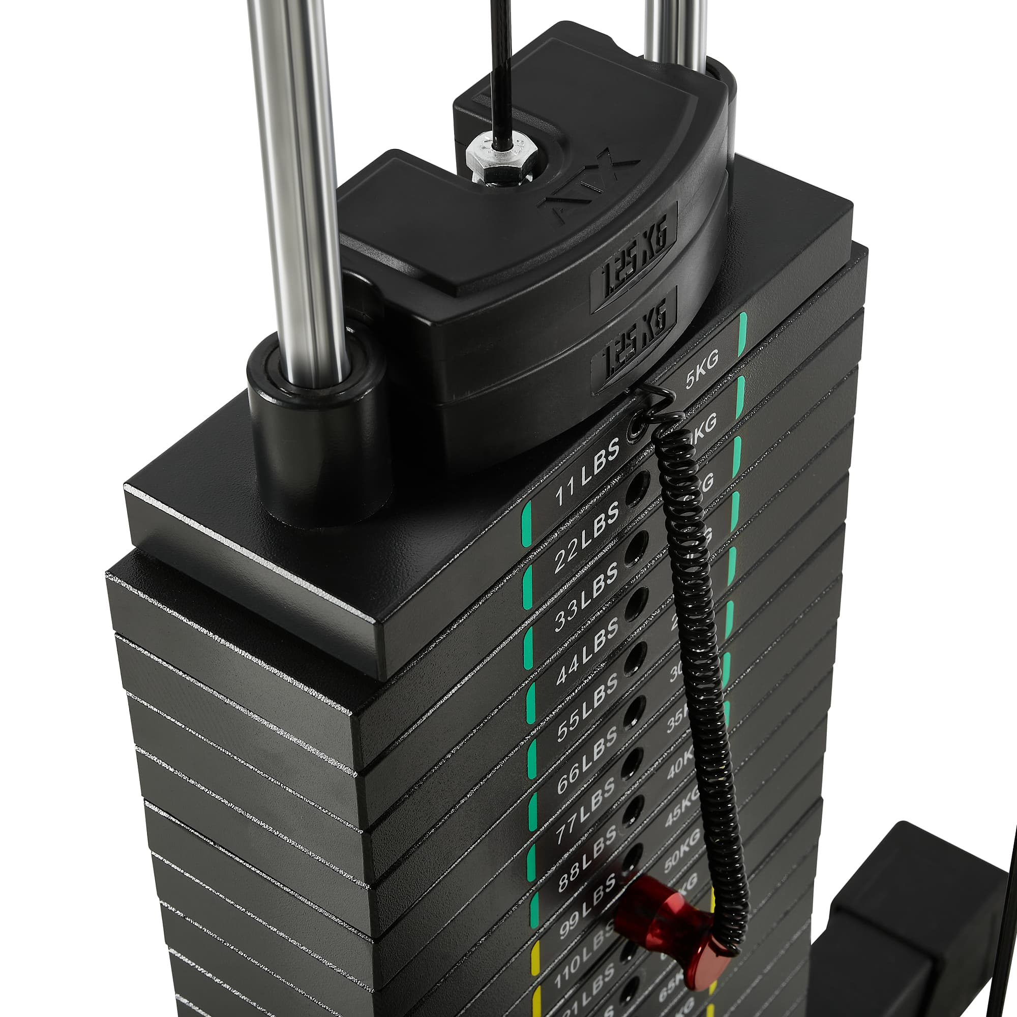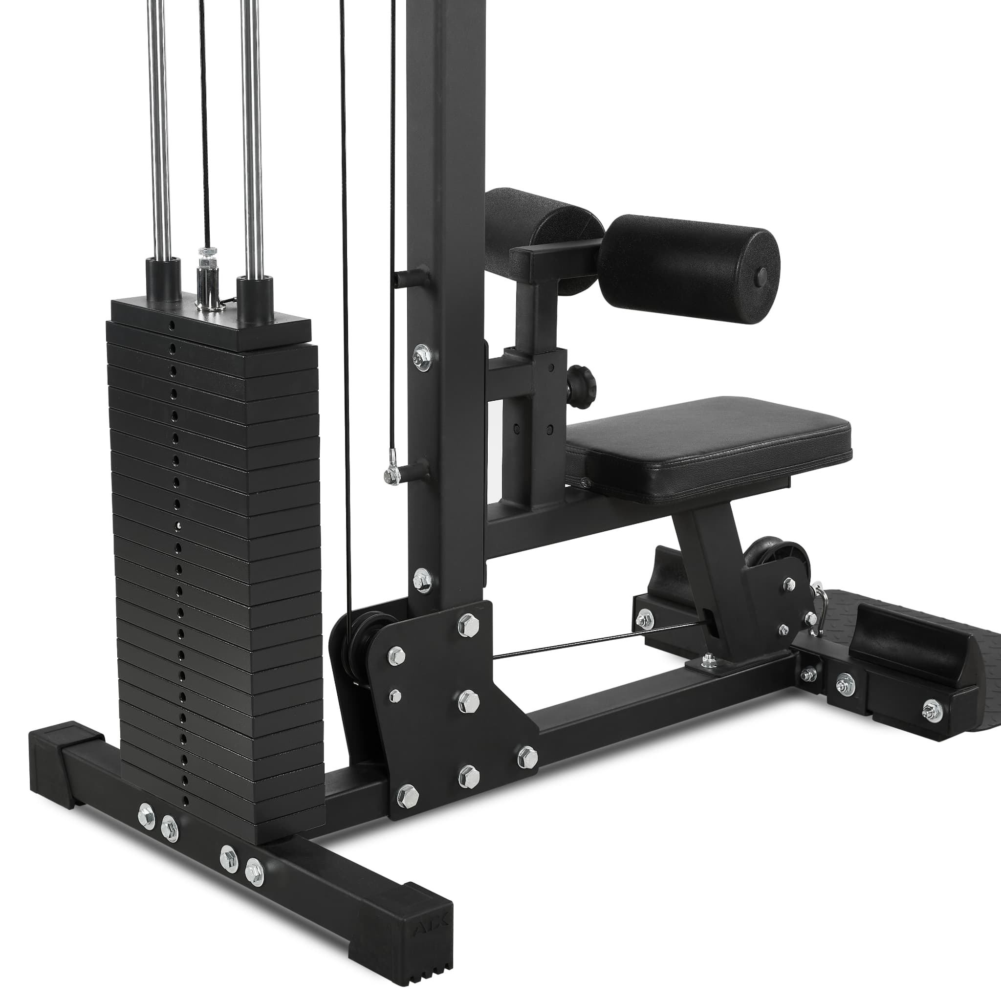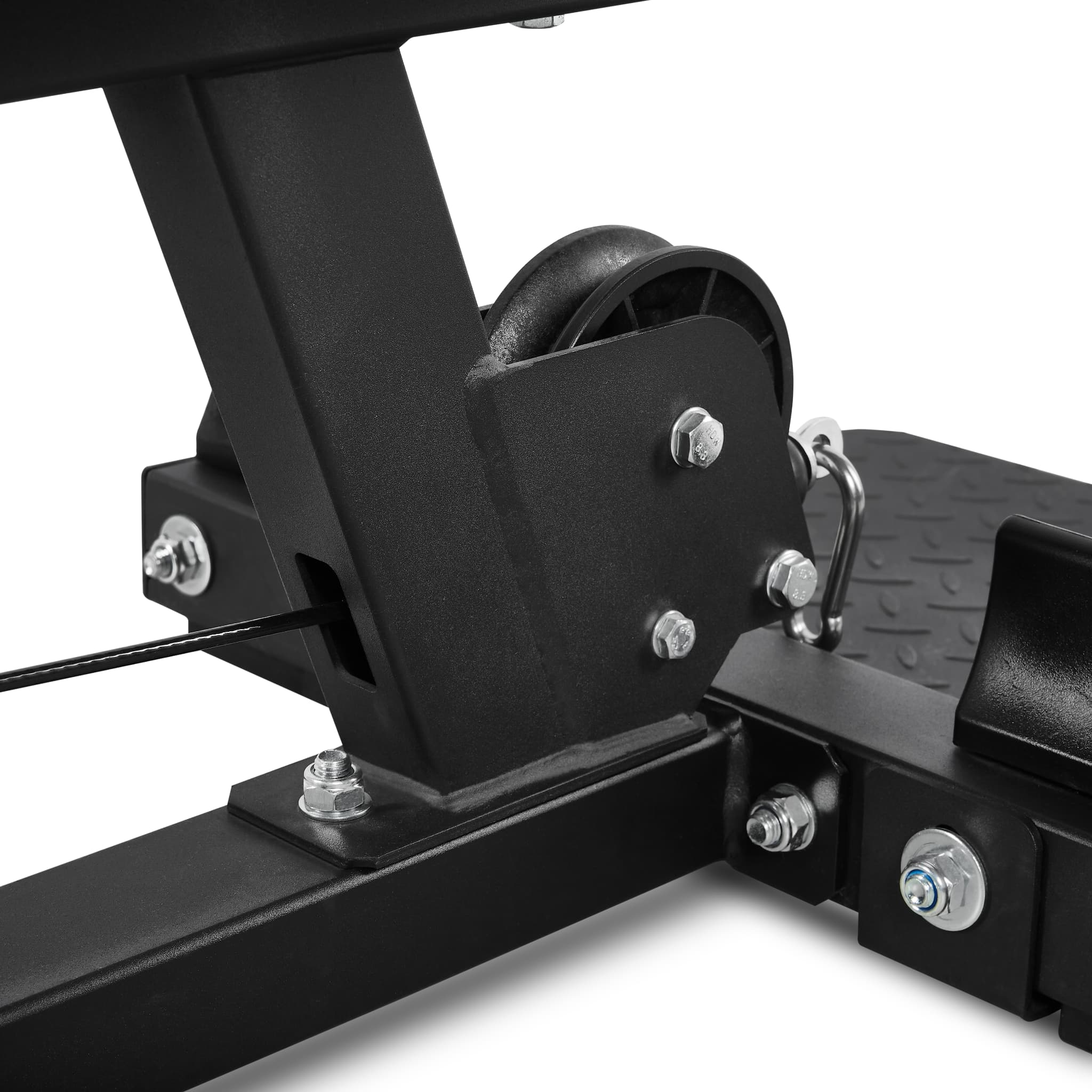 ウェイト比率は1:1(滑車による軽減なし)で、上下からのケーブルプルにおいて最大160kgの負荷に耐えうる堅牢な構造です。フレームは70 x 70 x 3mmの頑丈で安定したスチールチューブを採用しています。