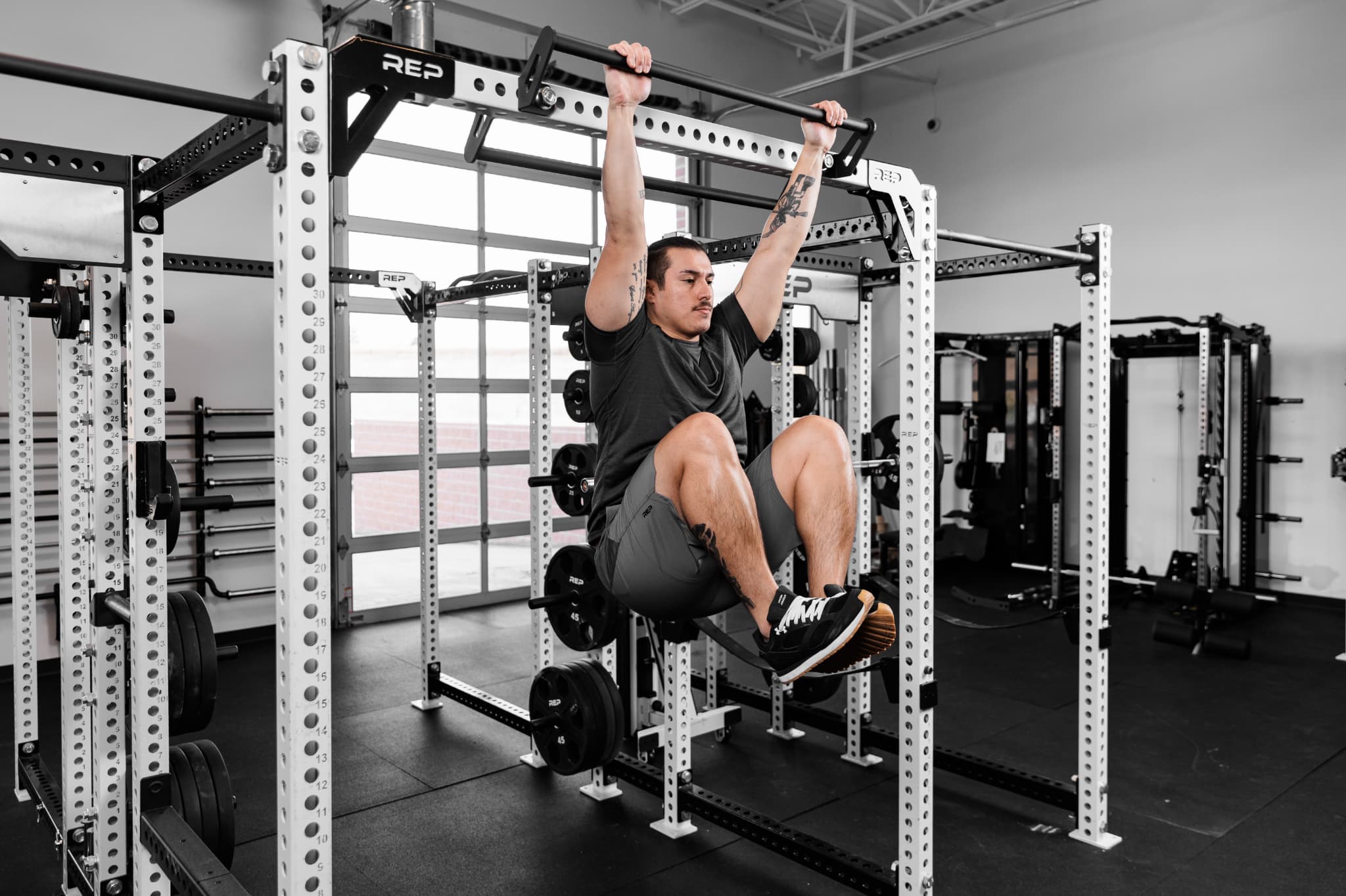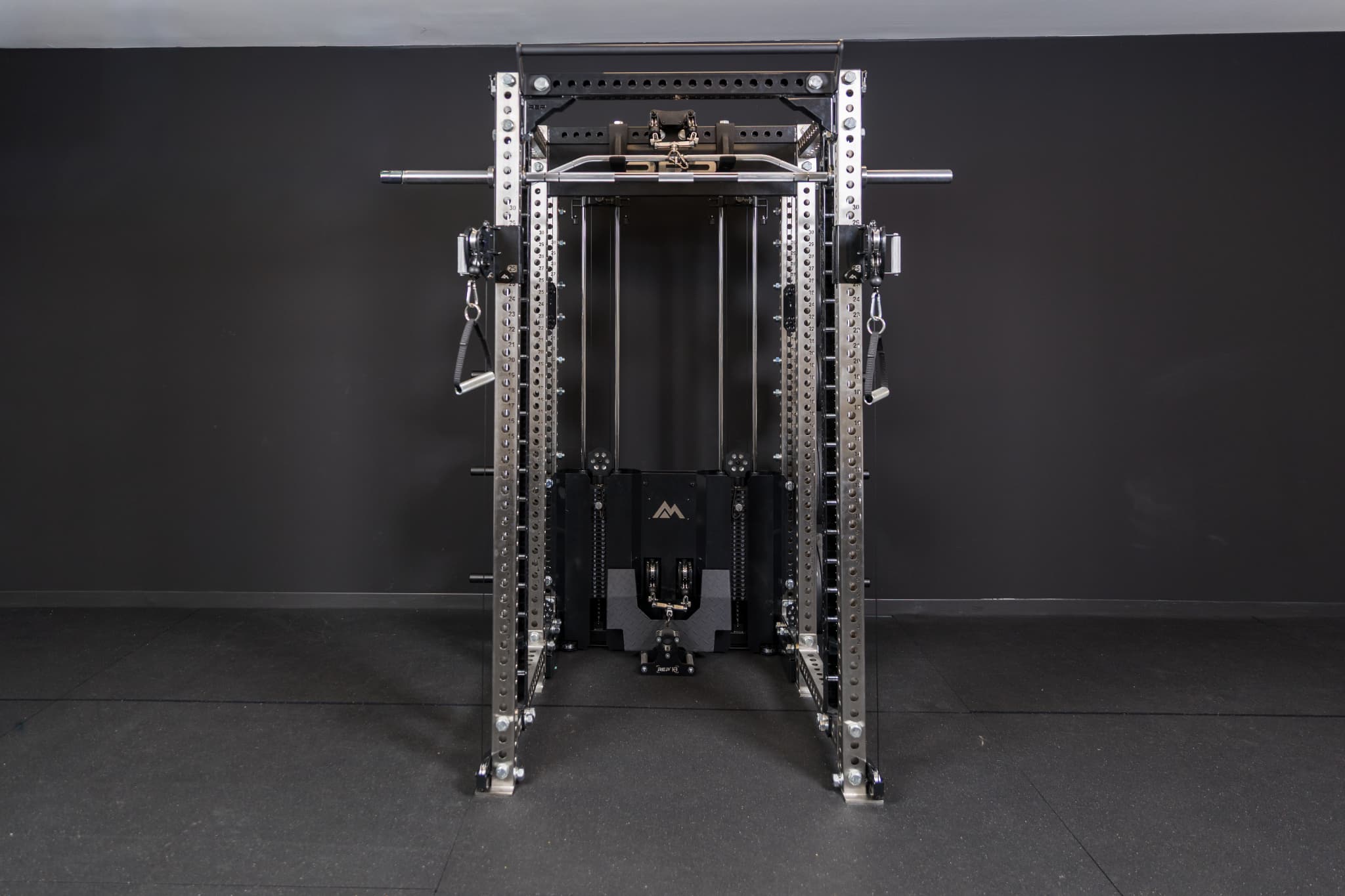ラック前面のクロスメンバーに取り付けることで、ラック内部のスペースを有効活用できるため、スミスマシンアタッチメントとの組み合わせも効果的です。