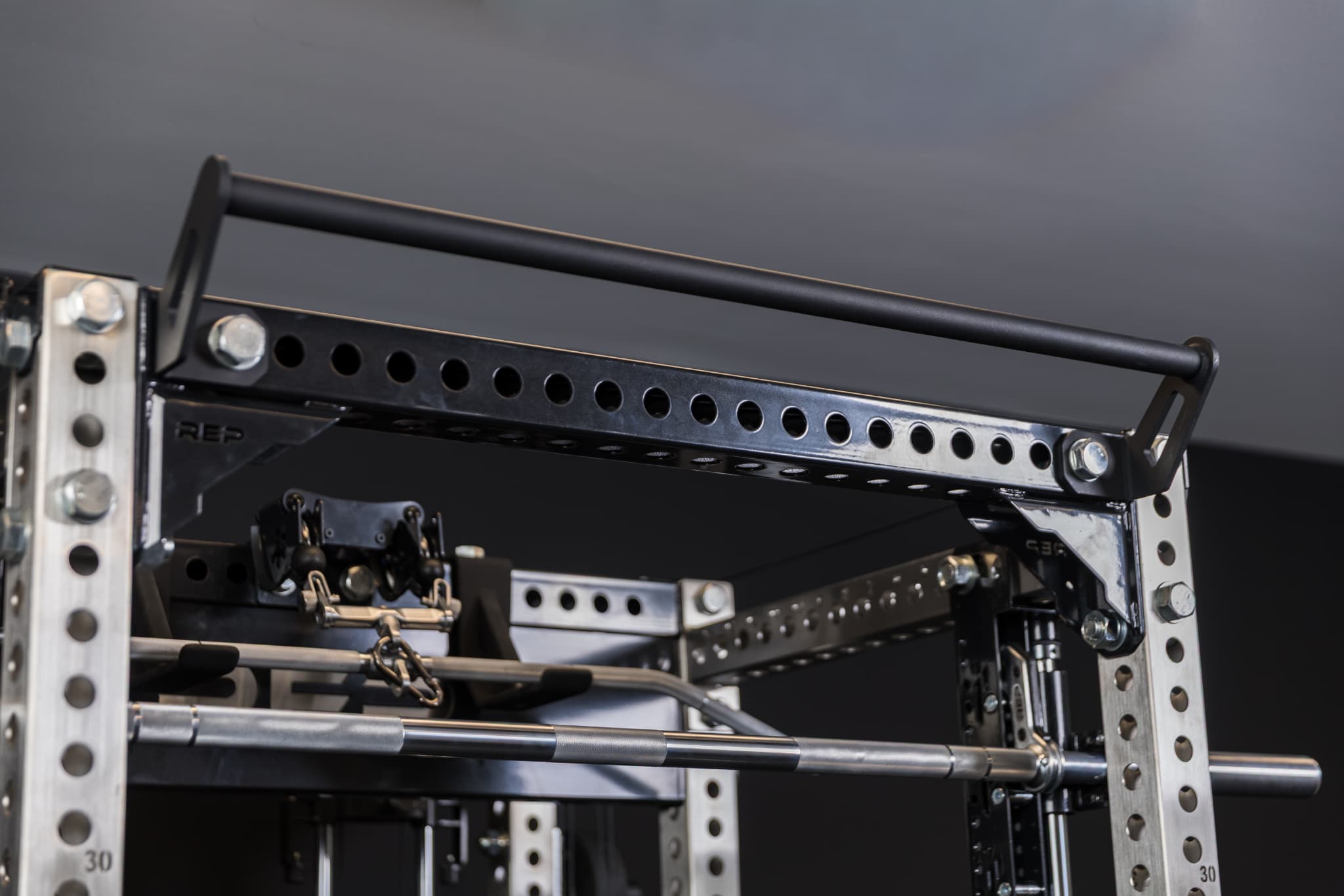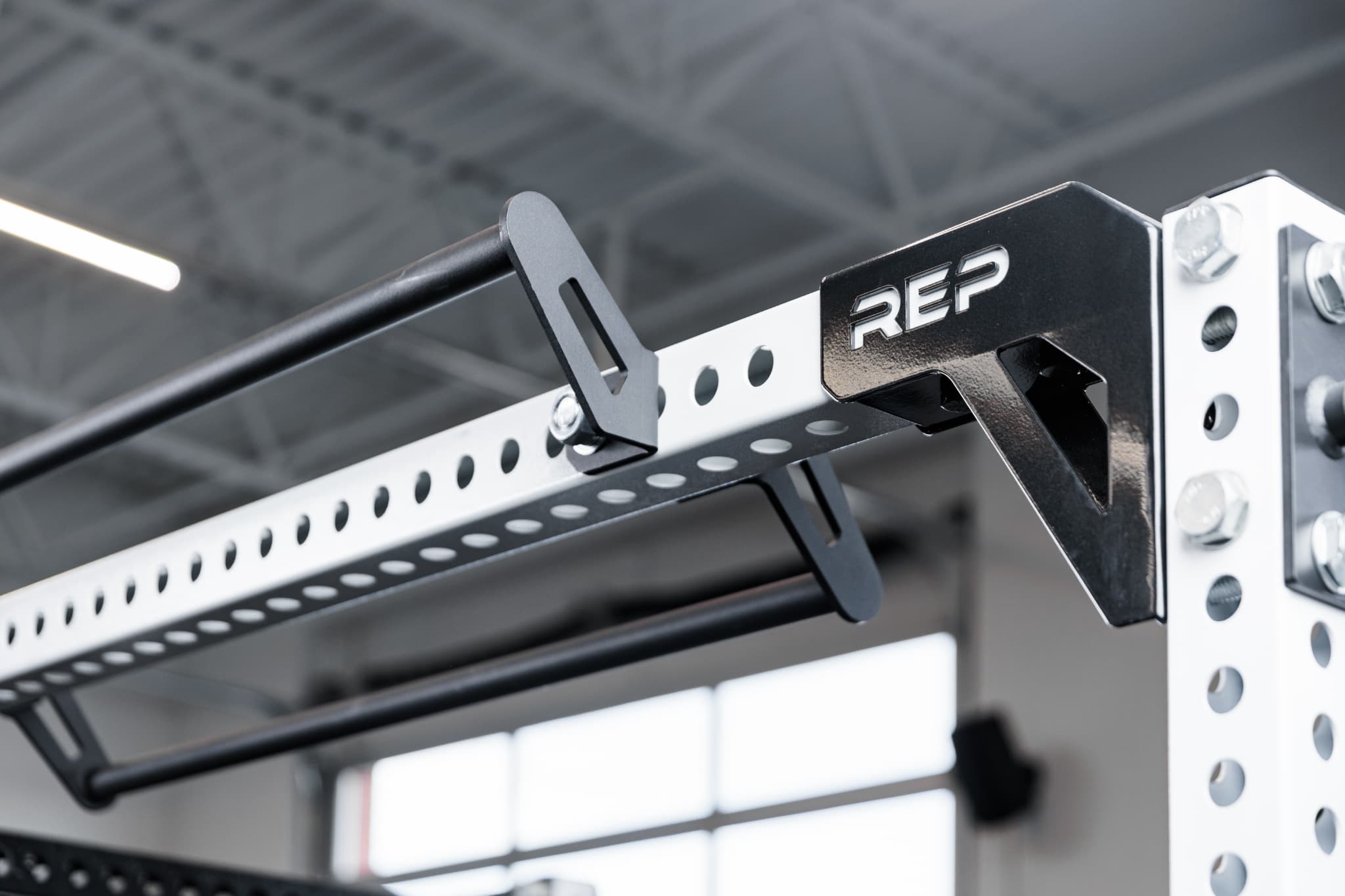 REP Fitnessのクロスメンバープルアップバーは、通常のプルアップバーが設置できないラック構成に対応するためのアタッチメントです。