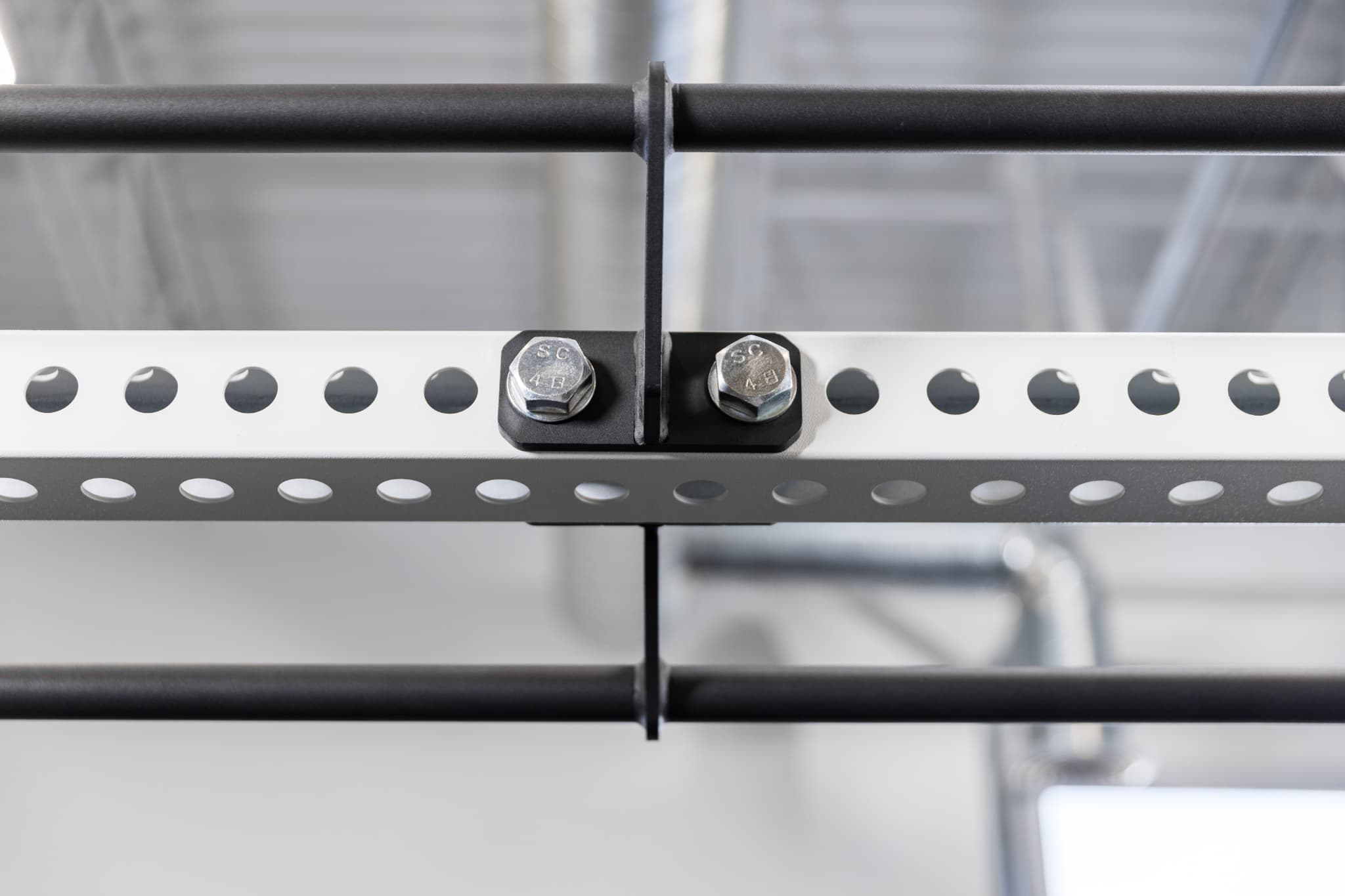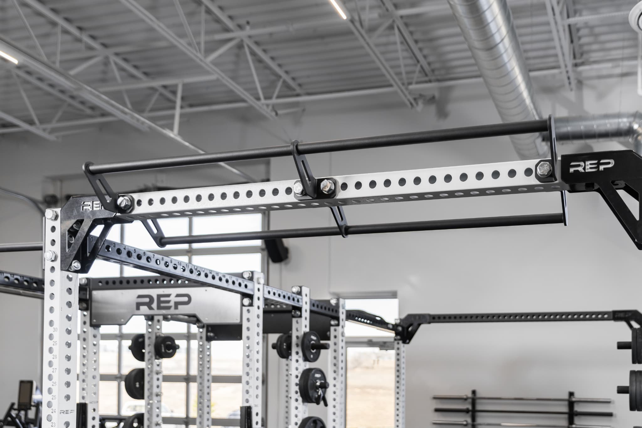 REP Fitnessのクロスメンバーダブルプルアップバーは、82インチのラッククロスメンバーコネクター専用のフロントマウント型プルアップバーです。1本のクロスメンバーに2つのプルアップバーステーションを追加でき、ラックの未使用スペースを有効活用できます。