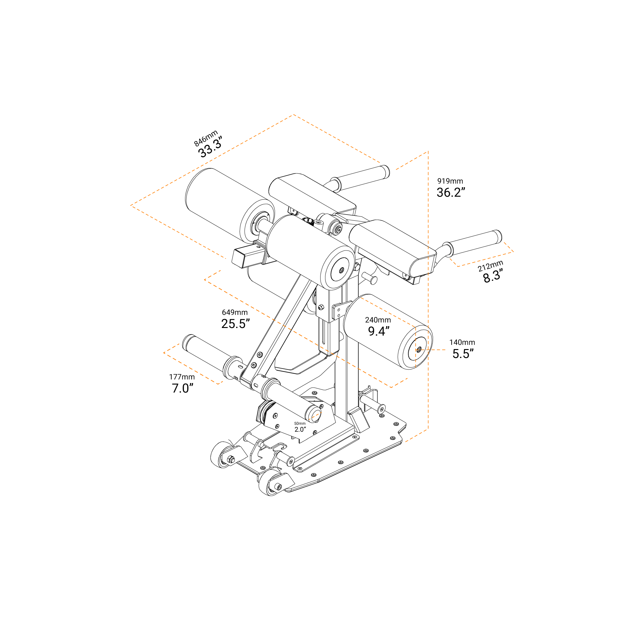 高さ調整可能なレッグローラーと本体側面のハンドルが身体をしっかり固定。さらに、フラット形状の太ももパッドを採用することで圧力を均等に分散し、レッグカール時も快適な使用感を実現します。