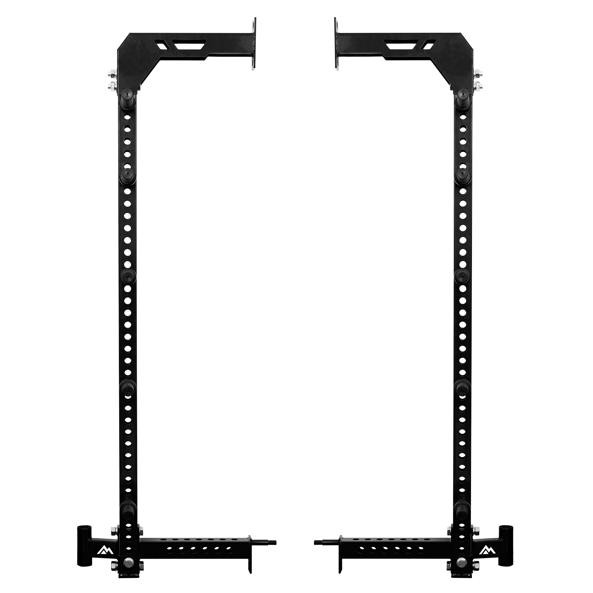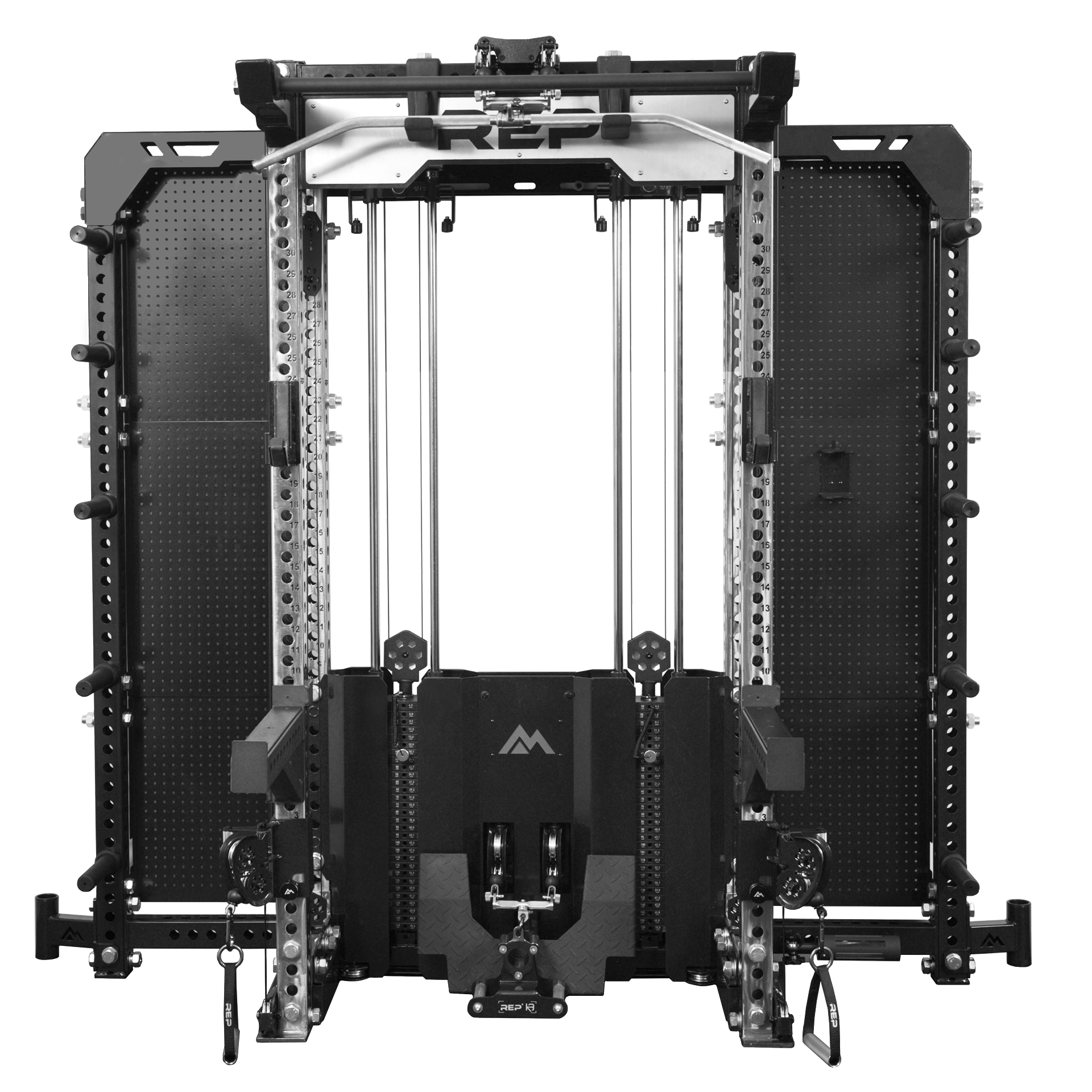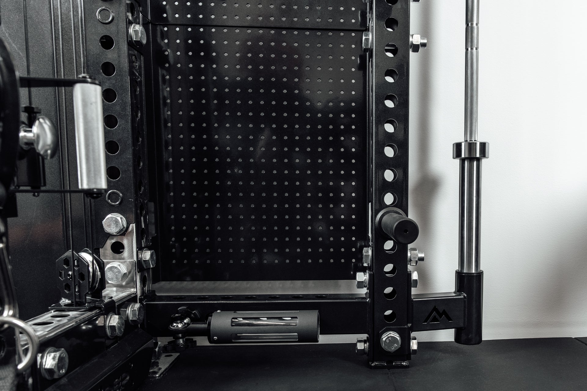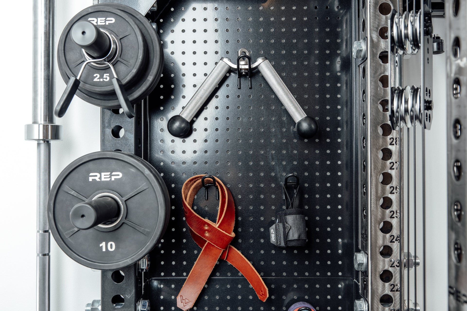 バーベルスタンドも左右に内蔵されており、プレートと合わせて最大2本のバーベルを収納可能です。 ペグボード(別売り)との組み合わせにより、ケーブルアタッチメントも一元管理できます。ホームジムから商業施設まで幅広く対応する、実用的な収納ソリューションです。