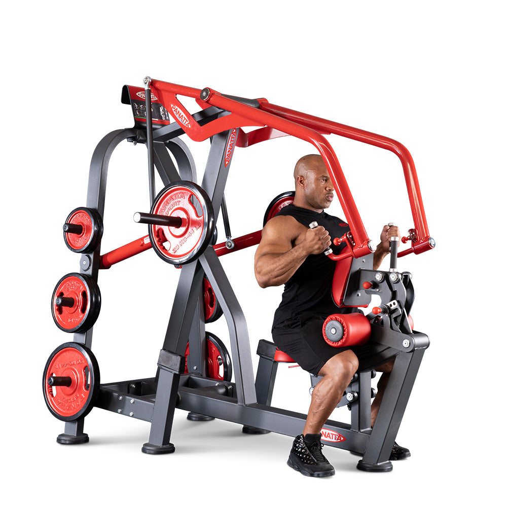 パナッタのスーパーハイロウは、広背筋、大円筋、菱形筋、僧帽筋といった背部の筋肉を総合的に鍛えることができるプレートロード式のロウイングマシンです。ハンドルは順手45°(ハの字)、逆手45°(逆ハの字)、ニュートラルの三段階で角度調節が可能。最大で270kgまでプレートを搭載できるため、高重量を扱うトレーニング上級者も安心してエクササイズが可能です。